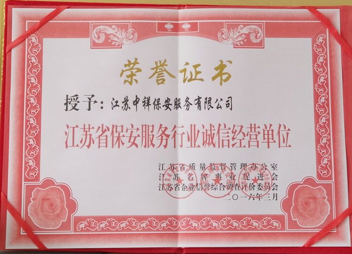 江蘇中祥保安公司被授予江蘇省保安服務(wù)行業(yè)誠(chéng)信經(jīng)營(yíng)單位榮譽(yù)稱號(hào)